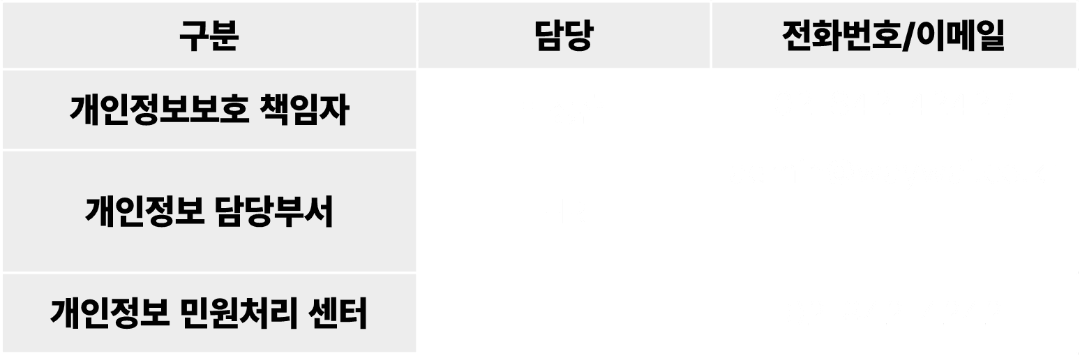 회사는 「개인정보 보호법」 제31조 제1항에 따라 개인정보 처리에 관한 업무를 총괄해서 책임지고, 개인정보 처리와 관련한 정보주체의 불만처리 및 피해구제 등을 위하여 아래와 같이 개인정보보호 책임자를 지정하고 있습니다. 또, 정보주체는 「개인정보 보호법」 제35조에 따른 개인정보의 열람 청구를 개인정보 담당부서에 할 수 있습니다.